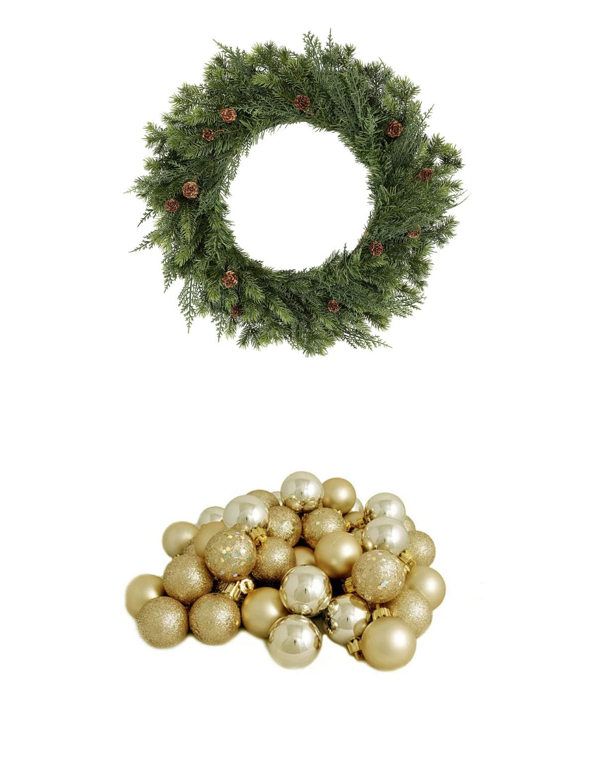 Bring the feel of the great outdoors inside with a spirited wreath – layered with the sophistication of gold shatter-proof ornaments.